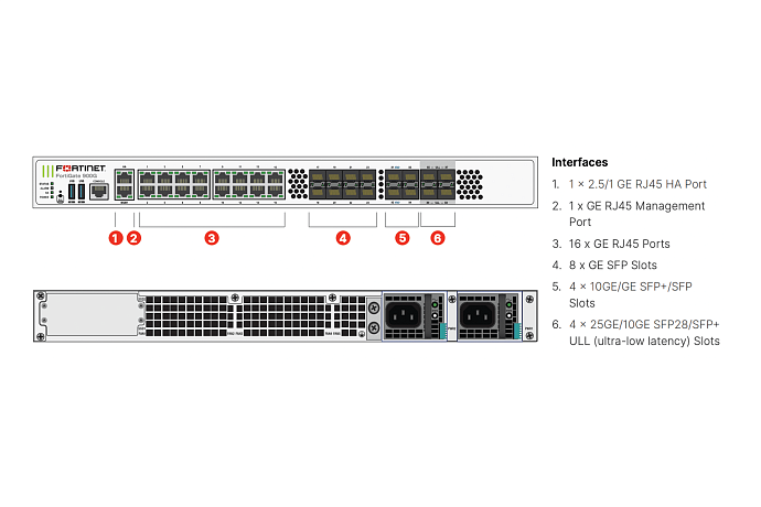 4x 25 GE SFP28, 4x 10 GE SFP+, 1x 2.5GE RJ45, 8 x GE SFP, 17x GE RJ45